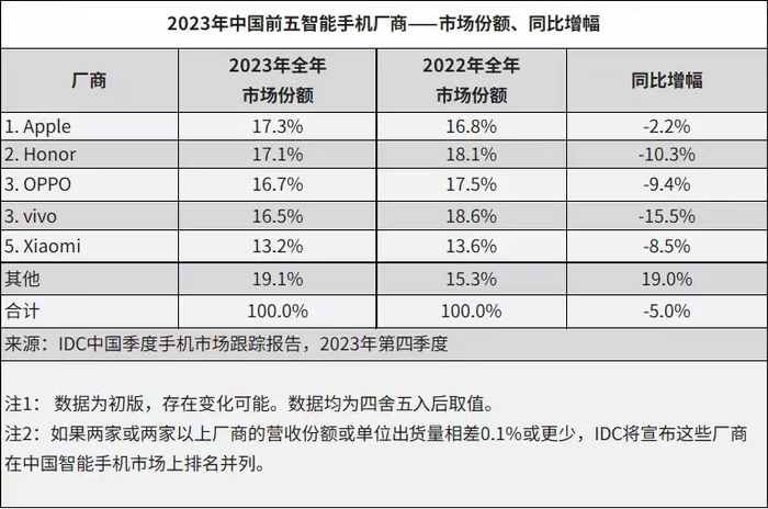 相较之下,苹果成为去年中国智能手机市场的最大赢家,首次拿下年度第一。而在过去五年内,苹果在中国的市场份额从8.9%上升至17.3%,成为华为高端市场的最大接盘者。荣耀则在脱离 华为后逐步捡回过往丢失的市场份额,并从去年三季度开始,攀升至国产手机第一。