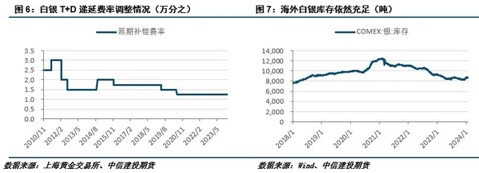 若要沪银期限结构恢复contango,正是需要以上两个问题得到解决。首先,国内现货白银偏紧,但国外白银存量充足,若有更多的白银流入国内,即可解决现货紧张的问题。这就需要白银内外盘价差维持高位,白银一般贸易进口窗口打开。即,沪银back结构的逆转或需要内外盘价差保持高位甚至扩大。其次,金融机构若减少递延费套利,则沪银就缺乏了back结构的推动力量。但若套利空间持续存在,银行等金融机构也难改变套利交易模式。不过,若是现货供应趋于宽松,空付多的确定性减弱,或者递延费率降低,套利收益减小,推动套利交易利润消化,就有利于沪银期限结构重回congtango。从历史来看,上海黄金交易所也多次调整递延费费率,在近期递延费支付方向有所失衡之下,上海黄金交易所调整递延费也不无可能。
