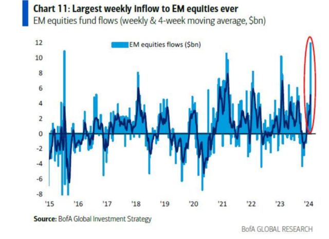 不仅美国上市中国大盘ETF看涨期权成交量激增,新兴市场股票基金周度流入也创下纪录。
