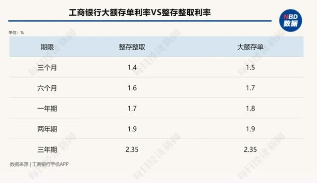 除了普通存款外,一般来讲,大额存单起存起点高、利率也较普通定期更具优势。但经历本次降息后,大额存单利率也与普通定期趋同。每经记者从工商银行APP上查询看到,该行大额存单20万元起存,一年期、两年期、三年期利率分别为1.8%、1.9%、2.35%,与各期限普通整存整取的最高利率相比较,一年及以下大额存单利率较普通定存高0.1个百分点。