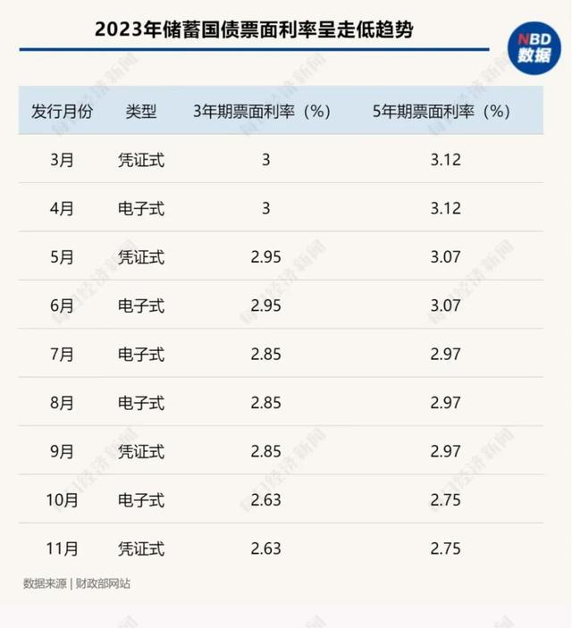 以刚过去的2023年为例,记者注意到,去年储蓄国债也经历了数次“降息”。3月发行的储蓄国债(凭证式)利率由前期的3年期3.05%、5年期3.22%,调整为3年期3%、5年期3.12%;5月发行的储蓄国债(凭证式),3年期和5年期利率再度下调5个基点,分别为2.95%和3.07%,这也是近年来储蓄国债票面利率首次降至3%以下;7月发行的3年期和5年期储蓄国债(电子式)利率分别降至2.85%、2.97%;10月发行的储蓄国债(电子式),3年期利率降至2.63%,5年期利率降至2.75%。