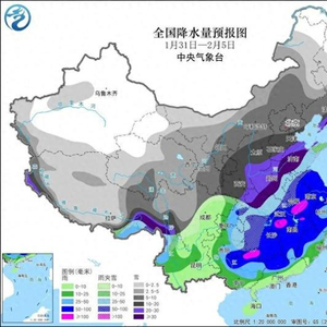 1月31日至2月5日,西北地区东部、华北、东北、黄淮等地有降雪,江汉、江淮西部和北部、湖南西北部、贵州中北部等地有雨转雨夹雪转雪,上述大部有中到大雪,部分地区有暴雪,局地大暴雪或特大暴雪;长江中下游及以南有中到大雨,部分地区暴雨。