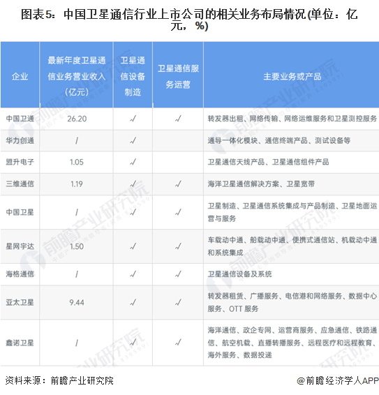 从我国卫星通信行业上市企业的业务布局情况来看,中国卫通的业务布局最为广泛,其主要业务或产品包括转发器出租、网络传输、网络运维服务和卫星测控服务;华力创通业务布局包括通导一体化模块、通信终端产品、测试设备等。