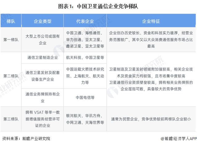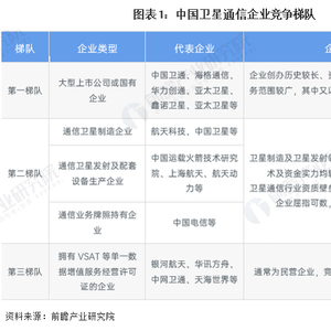 卫星通信行业产业链较为复杂,涉及领域较广且参与企业众多。整体来看,行业第一梯队主要以中国卫通、海格通信、华力创通、亚太卫星、鑫诺卫星等主营业务为卫星运营、卫星转发器出租或出售、地面设备制造的大型上市公司为主;行业第二梯队主要包括以中国空间、中国卫星等国有企业为代表的通信卫星制造企业,以中国运载火箭技术研究院、上海航天、航天动力为代表的卫星发射企业,以北斗星通、国腾电子、华力创通、南方测绘为代表的发射配套设备生产企业,以及以中国电信、中信数字媒体网络有限公司为代表的通信业务牌照持有企业,该类企业通常掌握高端核心技术或相关资质牌照,可提供卫星运营、卫星转发器出租及出售业务,具备一定竞争优势。行业第三梯队主要是以银河航天、华讯方舟、中网卫通、天海世界等拥有VSAT等单一数据增值服务经营许可证的企业,多成立于2000年以后,该类企业通常为民营企业,与前两梯队的大型国企及上市企业相比竞争优势较小。