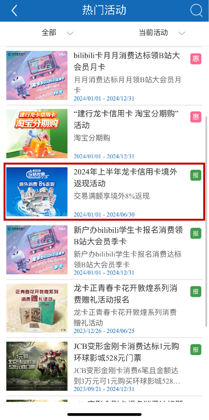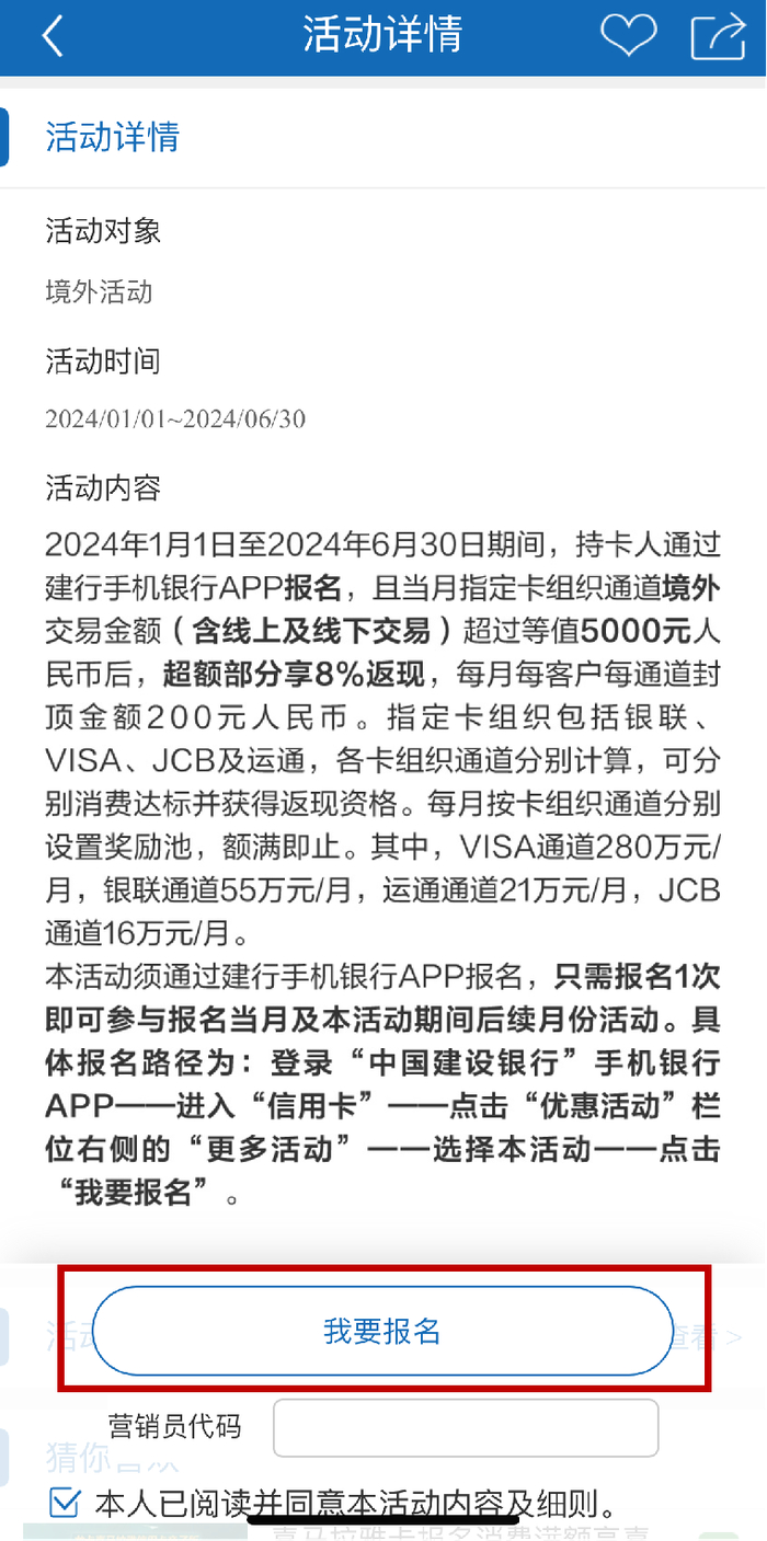 2024年1月1日至2024年6月30日期间,持卡人通过建行手机银行APP报名,且当月指定卡组织通道境外交易金额(含线上及线下交易)超过等值5000元人民币后,超额部分享8%返现,每月每客户每通道封顶金额200元人民币。指定卡组织包括银联、Visa、JCB及运通,各卡组织通道分别计算,可分别消费达标并获得返现资格。