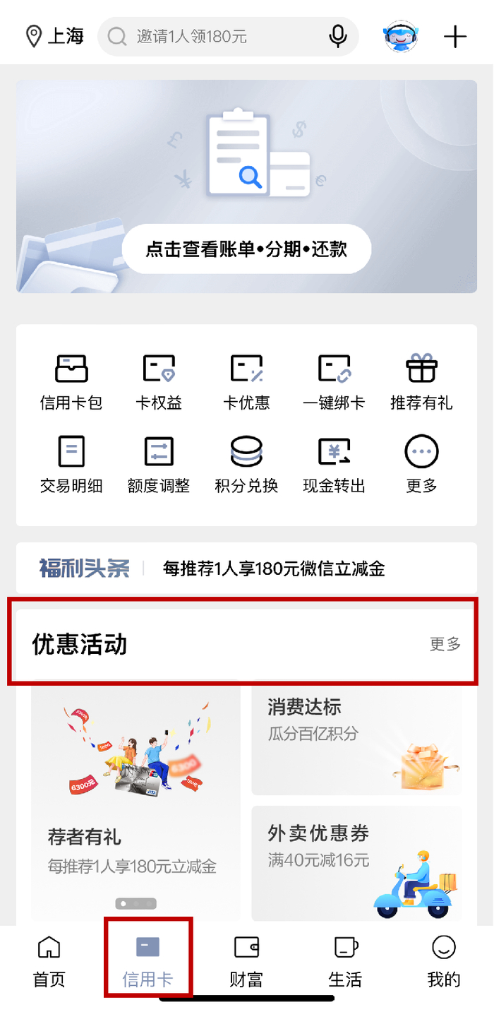 ①登录”中国建设银行“手机银行APP—点击“信用卡”-“优惠活动”-“更多”