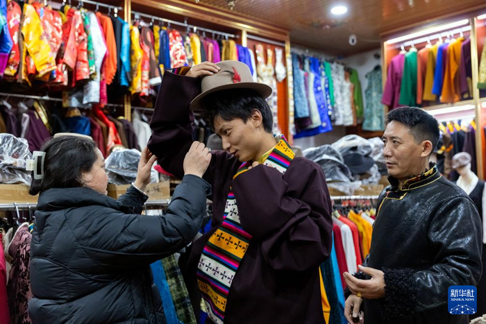 尼玛王登(右)帮助一名顾客试穿藏装(2023年12月21日摄)。新华社记者沈伯韩摄