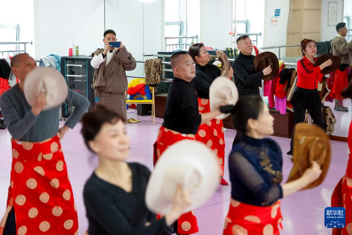 在四川省成都市锦江区锦江文化中心排练教室,尼玛王登(后)拍摄成都锦星艺术团团员们身着他家制作的藏装跳藏族舞蹈的情景(1月20日摄)。锦星艺术团成员基本是汉族,平时主要跳藏族舞蹈,团队表演所用藏装一直在尼玛王登家定制。新华社记者 沈伯韩 摄