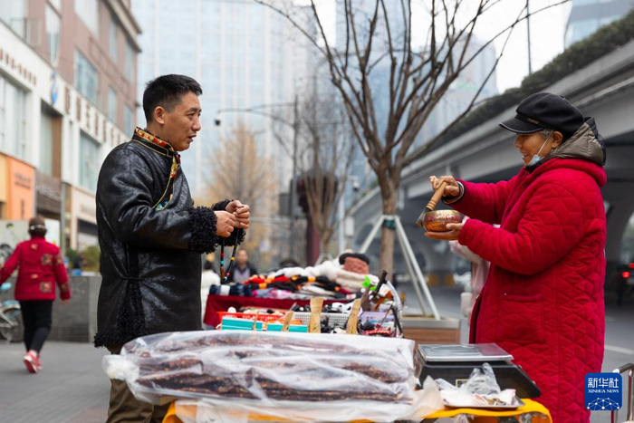 在西北街附近,尼玛王登(左)与他曾经帮助过的藏族居民攀谈,了解她的生活近况(1月5日摄)。工作之余,尼玛王登会在社区里跑前跑后,帮助少数民族同胞解决在成都遇到的各类问题,是街坊邻居心中的热心好大哥。 新华社记者 沈伯韩 摄