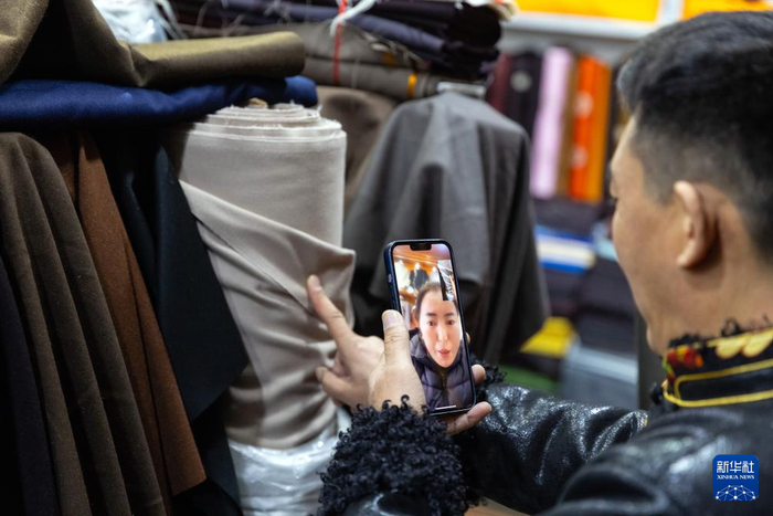 在成都“亿家天下”市场,尼玛王登用手机与客户视频通话,为其展示、讲解自己准备选用的藏装布料(1月5日摄)。新华社记者 沈伯韩 摄