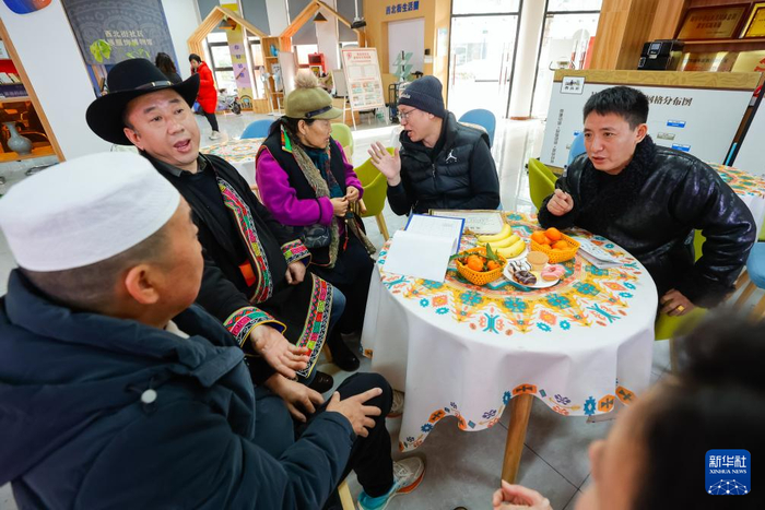 在四川省成都市金牛区西北街社区党群服务中心,尼玛王登(右一)与“西北街社区多民族商家促进会”的商家代表共同探讨社区治理相关议题(1月16日摄)。新华社记者 沈伯韩 摄