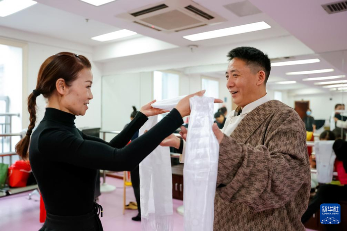 在四川省成都市锦江区锦江文化中心排练教室,尼玛王登(右)为他的老客户——成都锦星艺术团舞蹈老师曾光华送来定制藏装,并为她献上哈达,感谢其多年来照顾自己的生意(1月20日摄)。锦星艺术团成员基本是汉族,平时主要跳藏族舞蹈,团队表演所用藏装一直在尼玛王登家定制。新华社记者 沈伯韩 摄