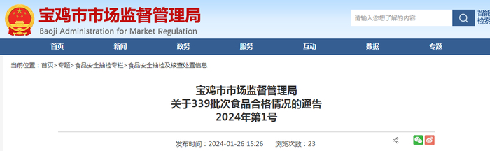 陕西省宝鸡市市场监督管理局关于339批次食品合格情况的通告(2024年第1号)