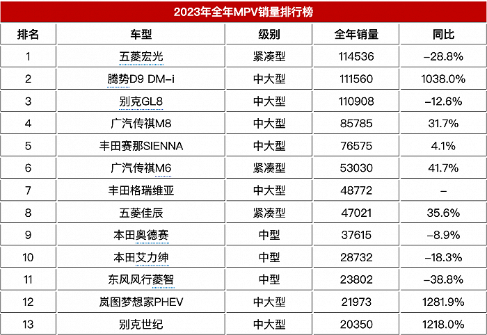 到整个2023年,国内MPV市场销量排行榜中,腾势D9 DM-i以111560辆的成绩超过别克GL8,而后者代表的燃油车型几乎全面溃败。
