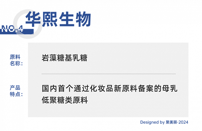 今年1月份,药监局化妆品新原料备案信息平台显示,华熙生物的新原料岩藻糖基乳糖成功通过备案。这是目前我国首个通过化妆品新原料备案的母乳低聚糖类原料。