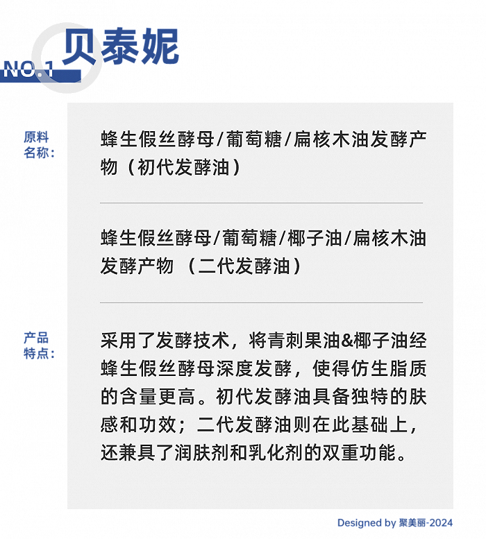 因此,在不改变青刺果油自身特殊脂肪酸比例的天然优势下,贝泰妮通过精准控制Biolipid(仿生脂质)生物转化条件,经过微生物培养、发酵、分离和纯化,得到了初代发酵油“蜂生假丝酵母/葡萄糖/扁核木油发酵产物”和二代发酵油“蜂生假丝酵母/葡萄糖/椰子油/扁核木油发酵产物”。