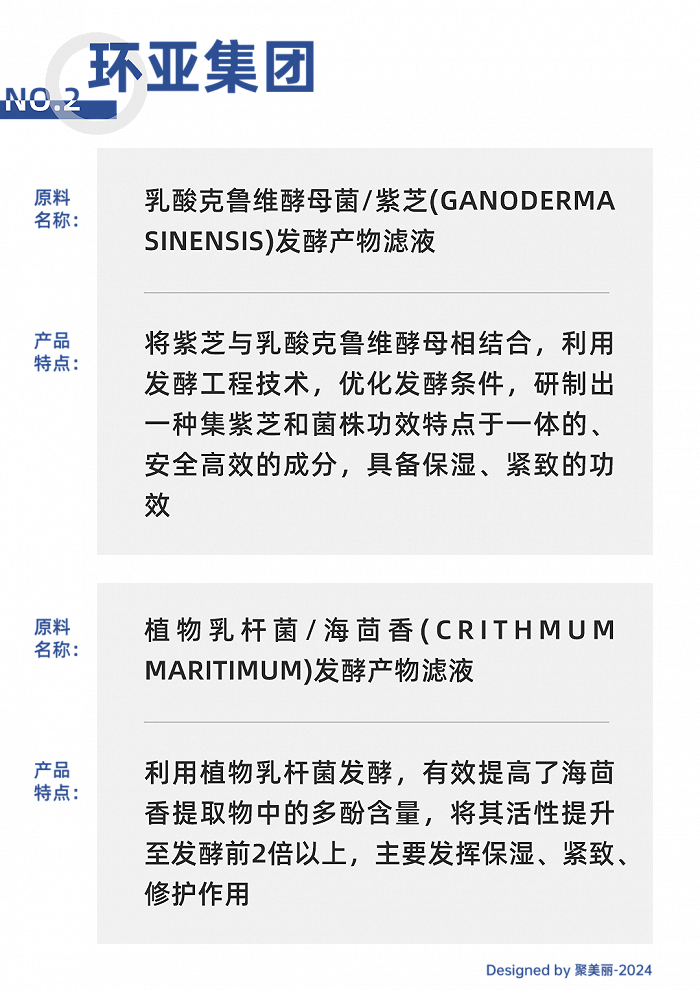 据药监局官网显示,今年,环亚集团已成功备案了两款新原料“乳酸克鲁维酵母菌/紫芝(GANODERMA SINENSIS)发酵产物滤液”和“植物乳杆菌/海茴香(CRITHMUM MARITIMUM)发酵产物滤液”,在中国特色植物原料的布局上再近一步。