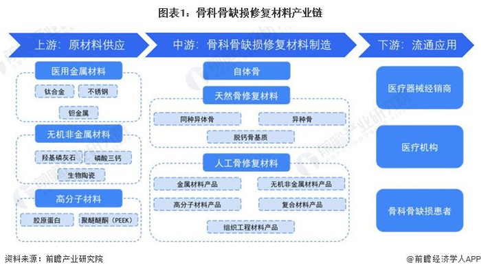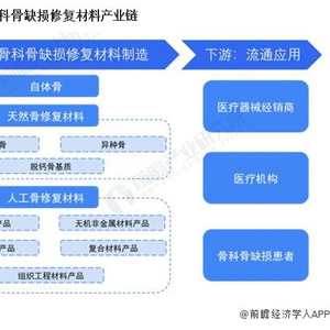 骨科骨缺损修复材料产业链包括上游医用金属材料、无机非金属材料、高分子材料等原材料供应,中游为骨科骨缺损修复材料制造,下游为流通应用环节。