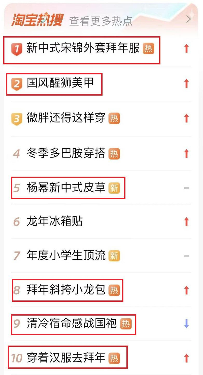 各大线上购物平台的数据显示,新中式外套拜年服、春节斜挎小“龙”包等国风元素的服饰类商品近期被频繁搜索。