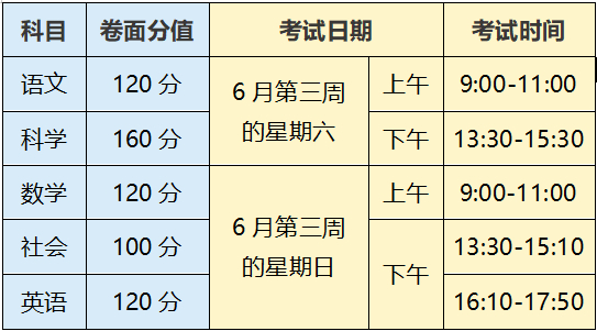 从2024年起,语文、数学、英语、科学、社会等5门科目实行省级统一命题,卷面总分值为620分。具体见下表: