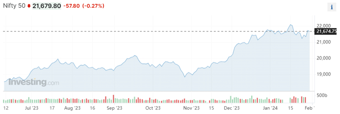 与此同时,印度股市今年迎开门红。Nifty 50指数去年实现了创纪录的上涨,随后在2023年上涨了20%以上。本月中,该指数首次突破22000点,周二早盘报21,679.80点。