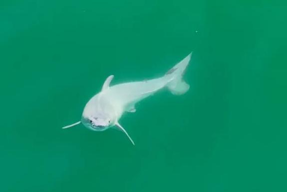 据英国《都市报》报道,科学家拍下了有史以来第一张野生新生大白鲨的照片。去年7月,野生动物电影制作人Carols Gauna和加州大学河滨分校的博士生Phillip Sternes在加州圣巴巴拉附近的水域通过无人机拍摄时,突然发现取景器上出现了这只大白鲨。