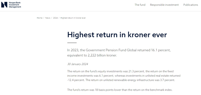 最新的全年收益报告显示,该基金2023年的股票投资回报率为21.3%,固定收益投资回报率为6.1%,而未上市房地产投资回报率为-12.4%,可再生能源基础设施方面的回报率为3.7%。