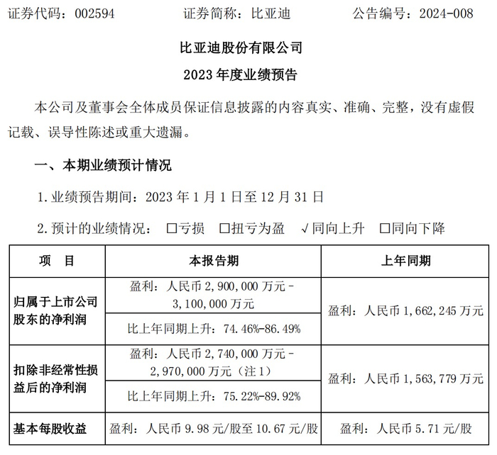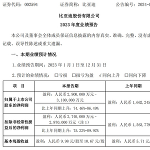 1月29日晚间,比亚迪发布2023年业绩预告显示,预计实现净利润290亿元到310亿元,同比上升74.46%至86.49%;预计实现扣除非经常性损益后的净利润274亿元到297亿元,同比上升75.22%至89.92%;基本每股收益9.98元至10.67元,上年同期为5.71元/股。