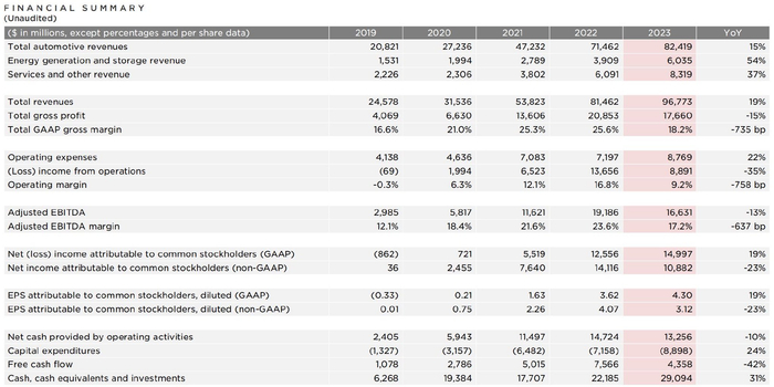 1月25日,特斯拉公布的业绩显示,2023年特斯拉全年总营收达967.73亿美元,同比增长18.79%,主要得益于特斯拉全球范围内新车交付量的快速提升。净利润149.97亿美元,同比增加19%(包括59亿美元的一次性非现金税收收益);非美国通用会计准则下净利润为108.82亿美元,同比减少23%。