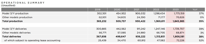 2023年特斯拉全球累计交付新车181万辆,同比增长38%,还不到比亚迪2022年186.85万辆的销量。