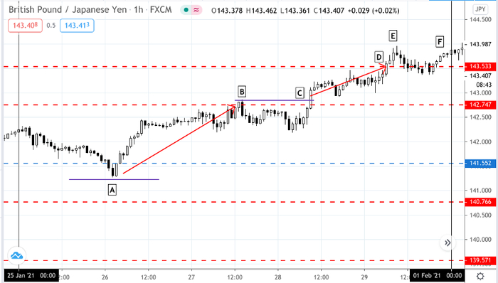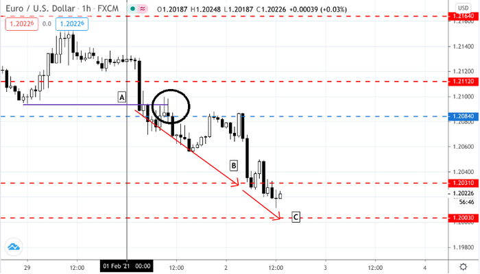 我们可以看到水平支撑阻力位和枢轴P点几乎重合,说明强度更大。A点处一根阴烛明显突破,我们最佳的进场位置是在圆处处,等待价格突破回调。我们注意到形成了Pinbar 蜡烛形态,做空! 目标位非常明显,我们可以选择S1 B点处平仓一半,S2 C点处平仓另一半。
