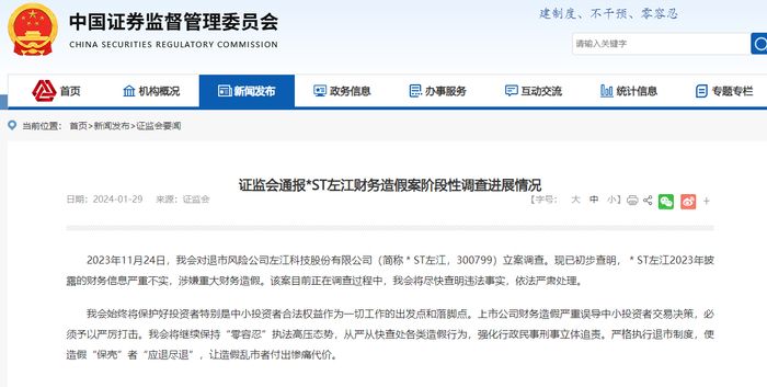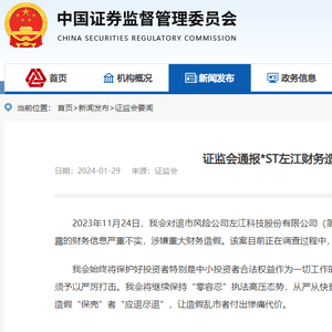 财联社1月30日讯(记者 高艳云)证监会今日通报*ST左江财务造假案阶段性调查进展情况,已于11月24日对*ST左江立案调查,现已初步查明,*ST左江2023年披露的财务信息严重不实,涉嫌重大财务造假。该案目前正在调查过程中,证监会将尽快查明违法事实,依法严肃处理。