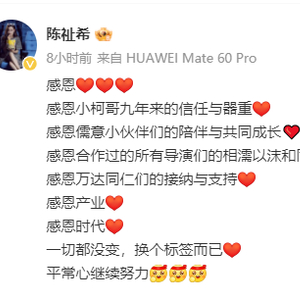 “感恩小柯哥(柯利明)九年来的信任和器重;感恩儒意小伙伴们的陪伴与共同成长;感恩合作过的所有导演们的相濡以沫和同舟共济;感恩万达同仁们的接纳与支持;感恩产业;感恩时代;一切都没变,换个标签而已;平常心继续努力。”1月30日,制片人陈祉希发布了这条微博。