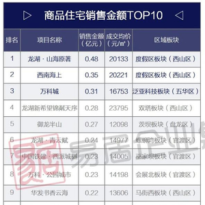 龙湖山海原著、西南海上、龙湖新希望锦粼天序为代表的高单价楼盘表现依旧十分抢眼,分别位列商品房住宅销售金额TOP第一、第二、第四。合计销售1.11亿元,占比约37%。其中成交均价最高的为龙湖新希望锦粼天序项目,为23795元/㎡。带有优质教育配套资源的万科城、万科公园里、华发书香云海等刚需盘持续热销。