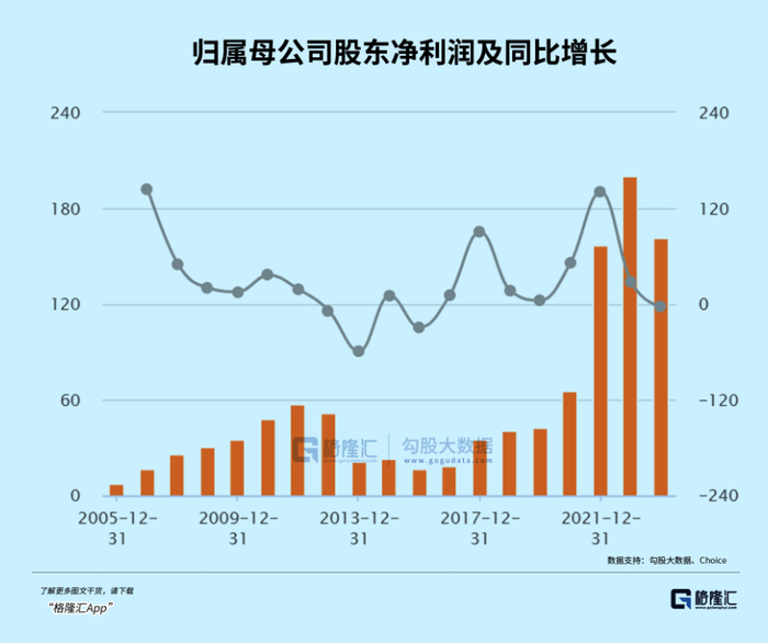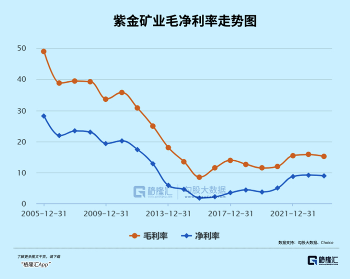 回顾2005年,紫金矿业营收仅仅30.69亿元,到2022年已经膨胀至2703亿元,年复合增速为30%。归母净利润从同期的6.98亿元增长至200.4亿元,年复合增速为21.8%。
