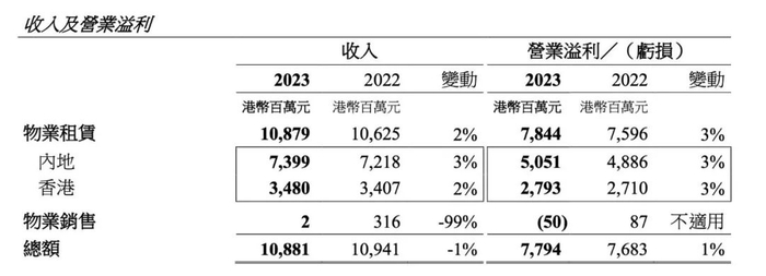 恒隆主打高端商场,2023年集团收入108.81亿港元,营业溢利77.94亿港元,与去年持平。