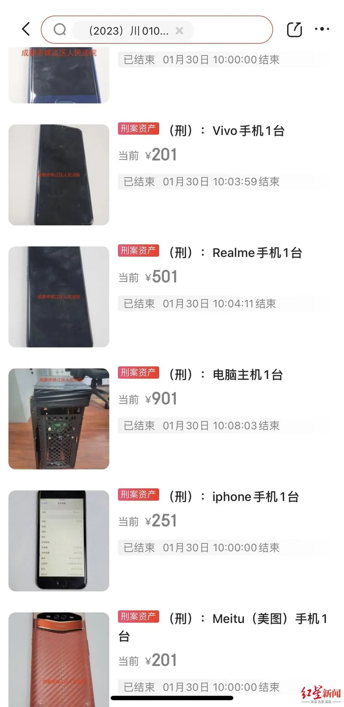 记者通过该案执行号【(2023)川0104执3369号】查询到,除上述iphone6s手机外,该案当天同时段公开竞拍的还有多件物品,包括Honor手机一台、Vivo手机一台、Realme手机一台、电脑主机一台、iphone手机一台、Meitu(美图)手机一台、小米手机两台,这些物品最后的成交价为101元至901元,其中一位名为叶某光的用户接连两次竞得了其中两台手机。