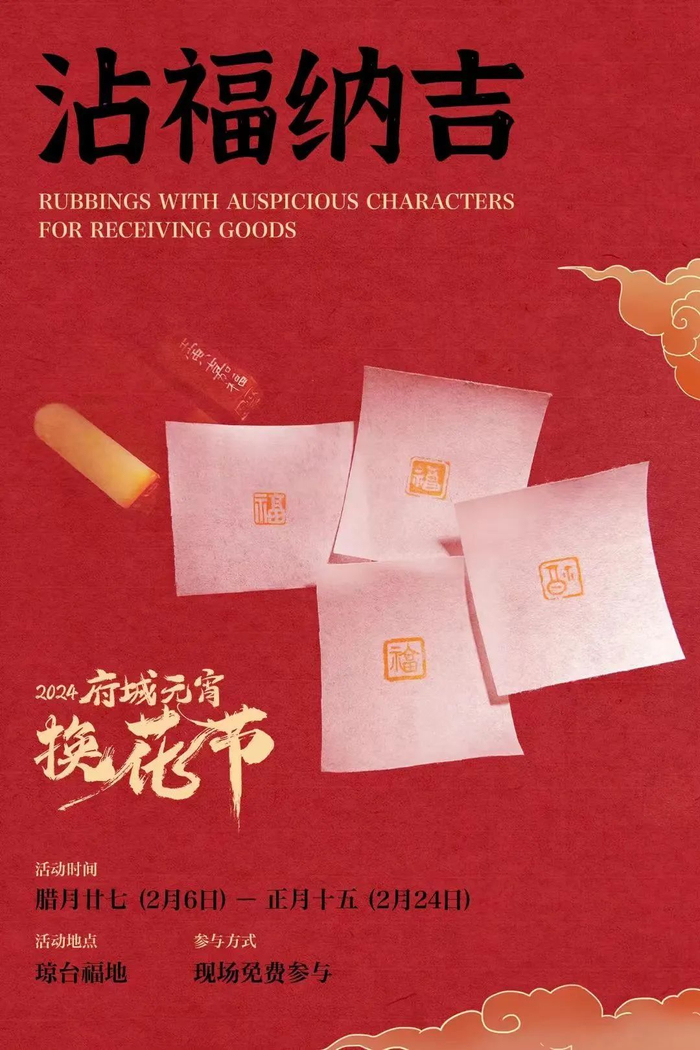 活动当天,在琼台福地将设置福字拓印互动活动,市民游客可前往进行免费拓福,通过各式各样的拓印,将福字、换花节、万事顺遂等字样拓印出来,沾福气,并将福气带回家。