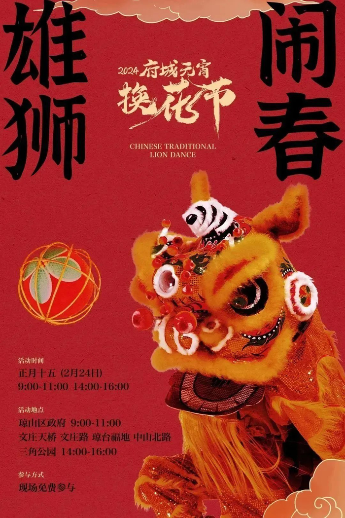 2024府城元宵换花节主办单位特邀本地舞狮艺术团为市民游客带来“舞狮闹春庆元宵”节目表演,通过舞狮表演、舞狮采青等环节,展示中国民俗文化的魅力风采。
