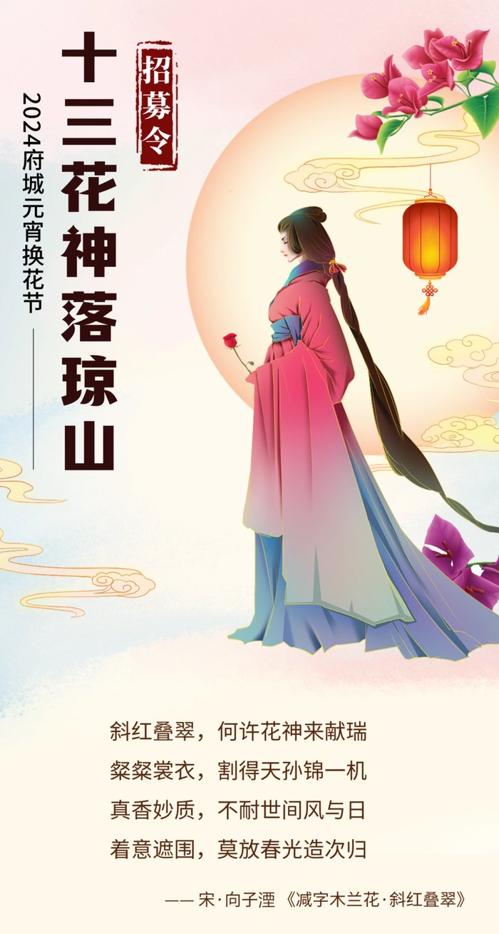 2024府城元宵换花节“十三花神”正在招募中!活动结合十三条古老的琼山街道,以十三种花卉为名,在全国范围内选拔出三位男性“花神”、十位女性“花神”,共计十三位“花神”。获选的“花神”们将参与今年换花节各项活动,成为元宵换花节的瞩目焦点。