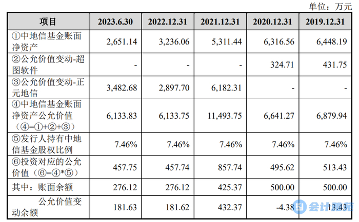 2023年5月,因中地信壹号减持正元地信股份7,851,666股,根据中地信基金协议相关约定,中地信基金向各合伙人进行基金的首次投资本金的现金分配,其中发行人获得分配的投资收益为43.66万元。截至2023年6月末,公司对中地信基金投资的账面余额276.12万元,公允价值变动余额为181.63万元,2023年1-6月公允价值变动收益金额为0.01万元。