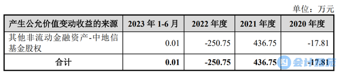 根据申报材料:报告期内,发行人公允价值变动收益分别为-17.81万元、436.75万元和-250.75万元,为持有的中地信投资基金的公允价值变动产生。