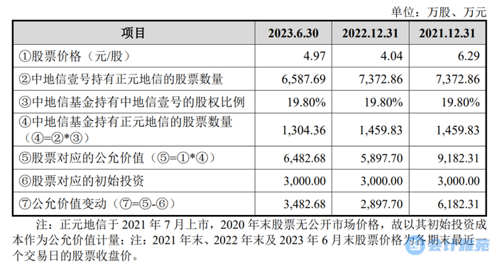 2、中地信基金间接投资的正元地信公允价值变动的计算过程