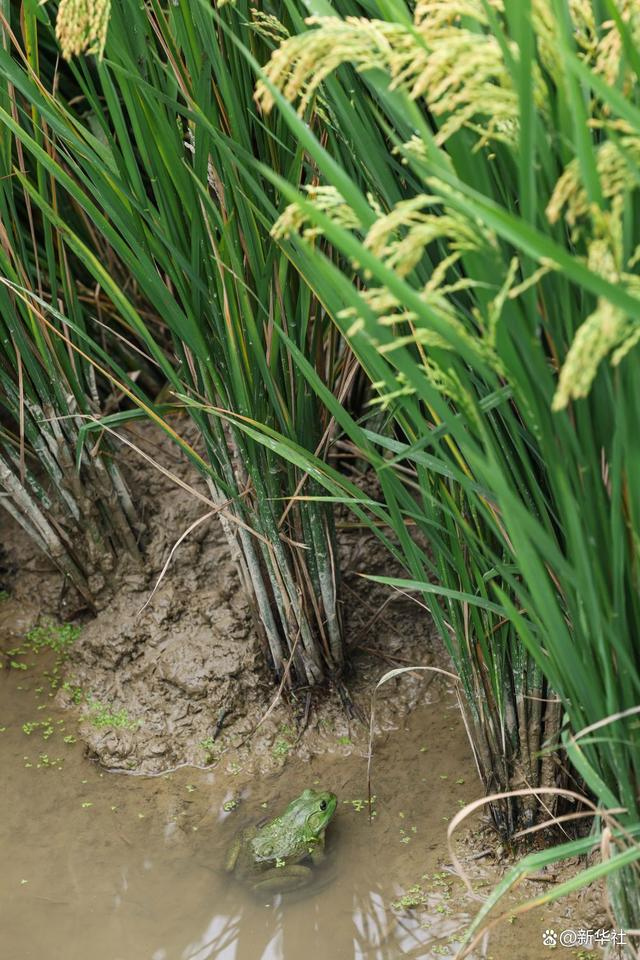↑ 2023年10月13日在杭州临安太阳镇的杭州佳稷农业生态稻米种植基地拍摄的稻田里套养的牛蛙,套养能让每亩增收2000至3000元。