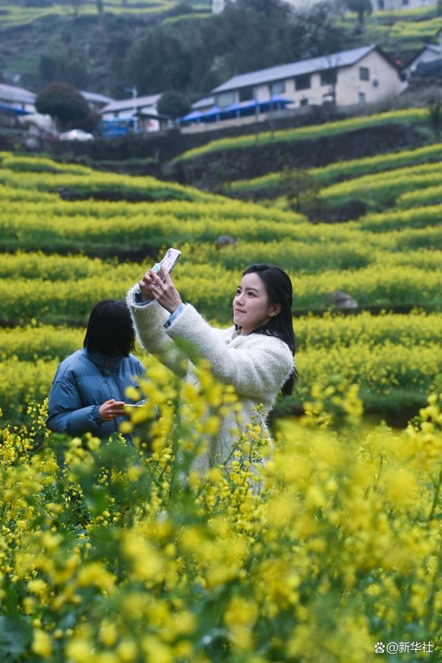 ↑ 2023年3月25日,游客在浙江省建德市乾潭镇邵家村胥岭自然村的油菜花梯田中拍照留影。浙江省建德市乾潭镇海拔400多米的邵家村胥岭自然村梯田油菜花纷纷盛开,当地举办以“花田有喜·同心共富”为主题的胥岭花朝节,吸引了各地游客前来观赏山村春季美景,共享春日美好时光。