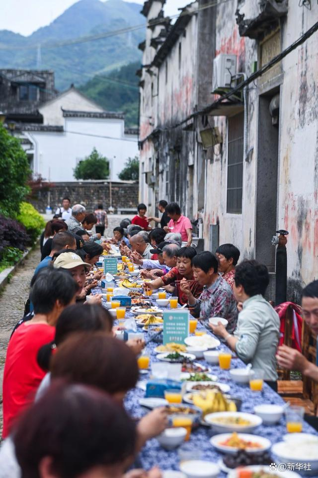 ↑ 2023年5月26日,老人们在斯宅村门前畈古民居的敬老宴现场品尝特色美食。