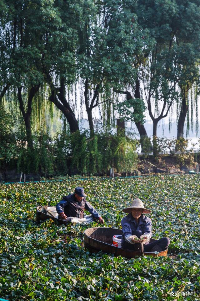 ↑ 2023年10月12日清晨,种植户划着菱桶采摘成熟的南湖菱。