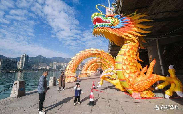 ↑ 2024年1月14日拍摄的青田县瓯江畔的神龙彩灯。随着农历新年的临近,浙江省丽水市青田县的乡镇及城区开始做龙灯、办灯展,形态各异的传统龙灯为迎接龙年新春佳节营造出浓浓的喜庆氛围。
