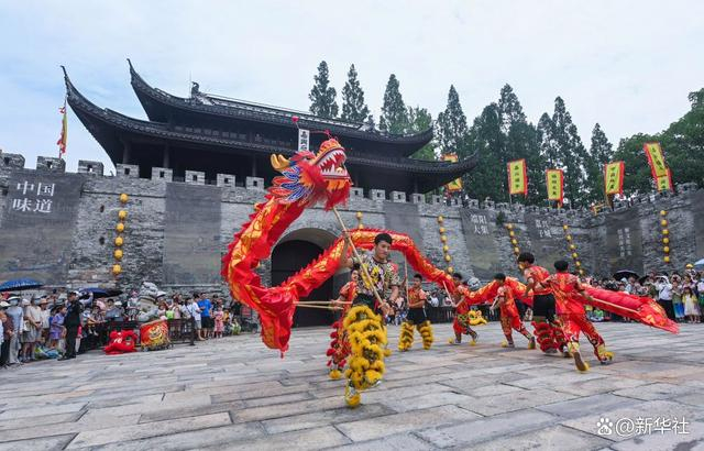 ↑ 2023年6月22日在浙江嘉兴子城遗址公园广场拍摄的舞龙表演。