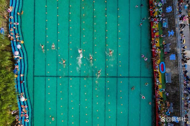 ↑ 2023年7月14日,村民在乾潭镇下包村胥溪天然泳场参加趣味比赛。